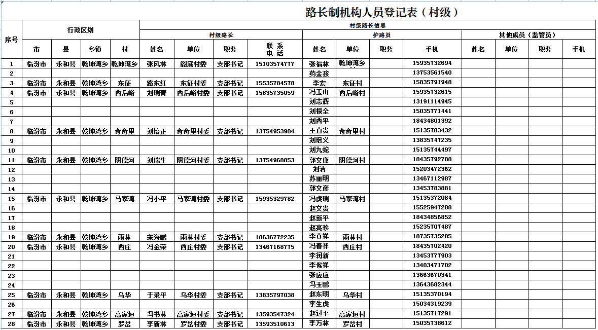 乾坤湾乡路长信息表
